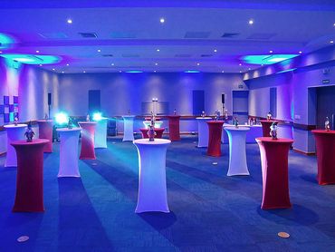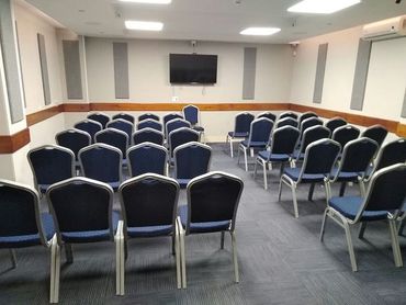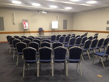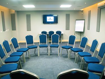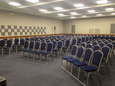 Arreglo de sillas y mesas que acomoda entre 30 y 80 personas dependiendo del salón reservado.